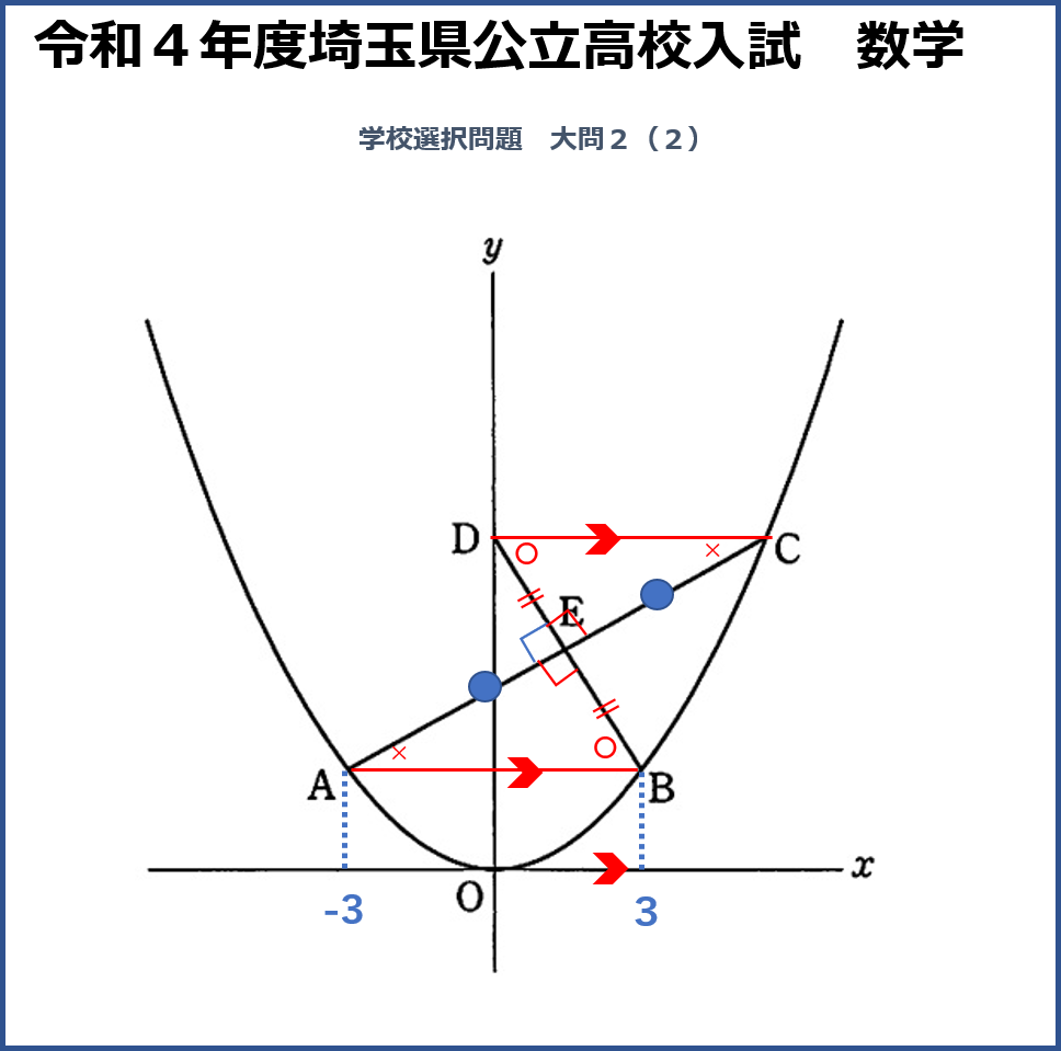 この問題の気付くべき点は、条件を読んでDCとABはx軸に平行ということです。次に、平行であり、Eが中点ということは、ABEの三角形とCDEの三角形は合同であることに気付いてください。詳しい合同条件は省略しますが、問題文に示されていなくても合同であるということに気付かなければいけません。