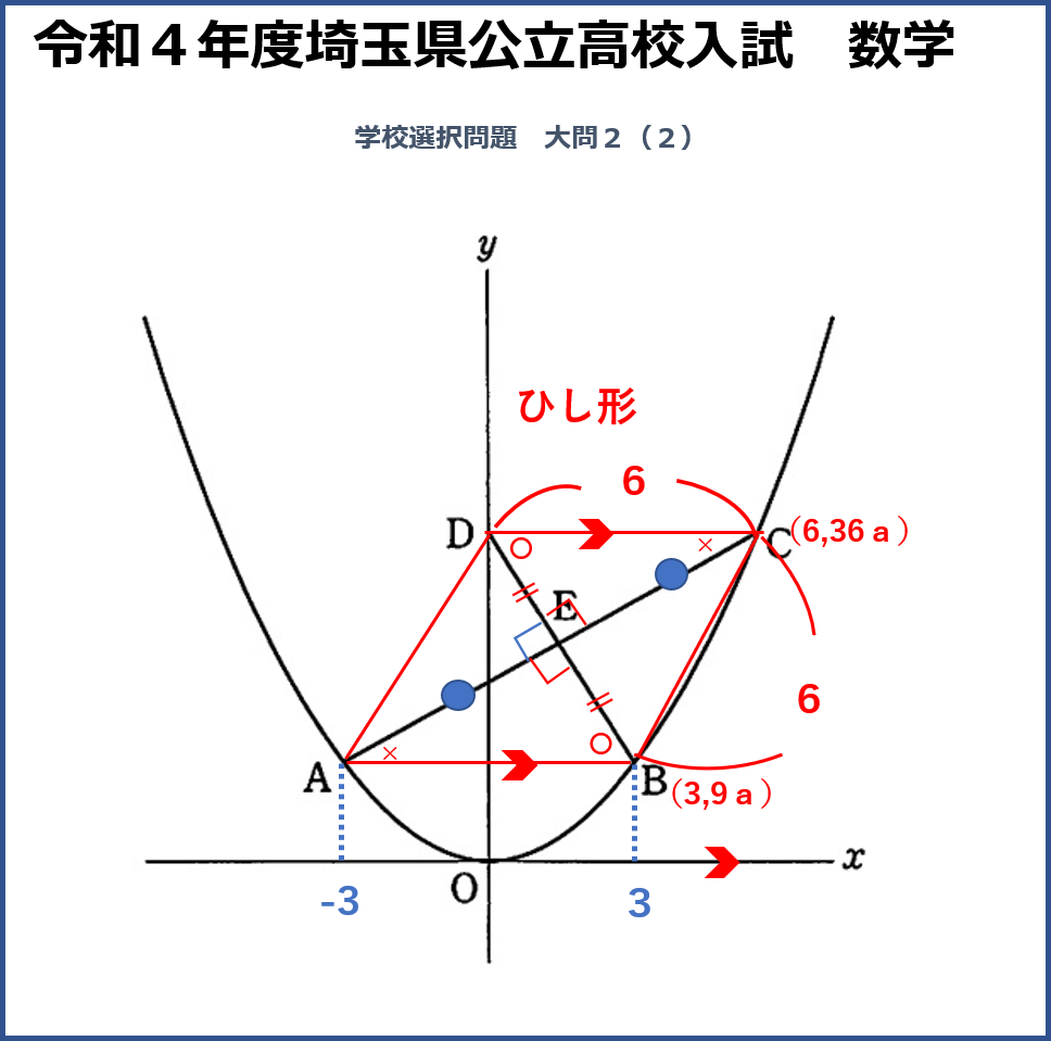 「ひし形」が分かれば4つの辺は等しいということが分かるので、線BC、CDの長さは6。曲線の関数は※1なのでB(3,9a)、C(6、36a)です。次に式を立てます。これは中学3年生の後半で学習する内容を使います。